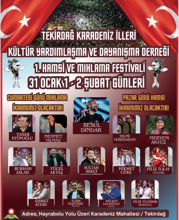 Tekirdağ Karadeniz İlleri Kültür Yardımlaşma ve Dayanışma Derneği Başkanı Muharrem Akyüz, bu yıl kentte ilk kez Hamsi ve Mıhlama Festivali yapılacağını açıkladı. Akyüz, 31 Ocak - 2 Şubat tarihleri arasında gerçekleştirilecek festivalde 4,5 ton hamsi ile 500 kilo mıhlama ikram edileceğini söyledi. Yayla şenliklerinin ardından kente yeni bir festival kazandıracakları için heyecanlı olduklarını ifade eden Akyüz, "Bizim kışın hiçbir aktivitemiz yoktu bugüne kadar, hem üyelerden bu yönde bir talep oldu hem de Tekirdağlı hemşerilerimizden ciddi bir talep oldu. Her yerde hamsi şenliği yapıyorsunuz neden burada yapmıyorsunuz diye. İnsanlar bir beklenti içerisine girdi, bizde yönetim kurulu olarak çalışma yaptık ve bu sene yapmaya karar verdik" dedi.Festivali geleneksel hale getirmek istediklerini belirten Akyüz, "3 gün sürecek etkinliğimiz, ünlü sanatçılarımız var. Cuma günü normal konserlerimiz olacak, Cumartesi günü 500 kilo peynirden yapılmış olan mıhlamayı halkımıza ikram edeceğiz. Pazar günü 4,5 ton Karadeniz hamsisi geliyor, onu da pişirerek ekmek arası şeklinde insanlara dağıtacağız. Onun yanı sıra müzik olacak, Resul Dindar sahne alacak. Hem Süleymanpaşalılar için hem de derneğimiz için yine çok güzel, kapsayıcı, kültürümüzü yaşatacak güzel bir etkinlik olması için elimizden geleni yapıyoruz. Bu ilk olacak ama bundan sonra geleneksel hale getirmek istiyoruz, her sene bu aylarda geliştirerek, büyüterek yapmak istiyoruz. Bütün Tekirdağlıları festivale davet ediyorum" diye konuştu.Vatandaşlar, şenlikte Trabzon ekmeği, Akçaabat köftesi, Vakfıkebir tereyağı, karalahana çorbası, karalahana sarması gibi Karadeniz Bölgesi'ne ait yöresel yemek ve ürünlerin sergilendiği stantları gezme fırsatı bulacak. Yöresel sanatçıların da sahne alacağı festival 3 gün sürecek.
